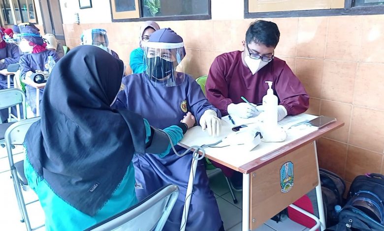 Sejumlah sekolah di Kota Kediri mulai mempersiapkan diri untuk pembelajaran tatap muka. Seperti yang dilakukan oleh SMKN 3 Kediri, Senin, (6/9/2021). Sebanyak 750 siswa-siswinya mendapatkan suntikan vaksin Covid-19.