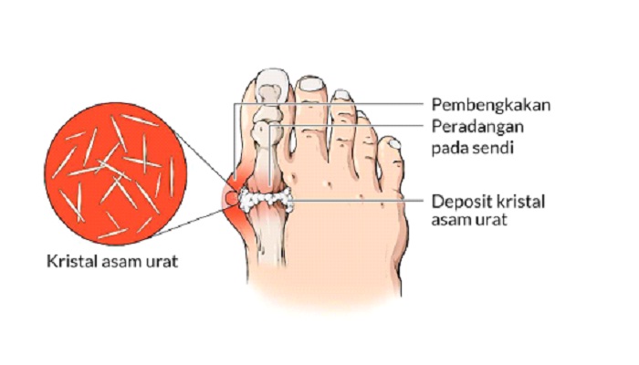 Penyakit asam urat disebabkan oleh penumpukan kristal asam urat pada sendi. Kondisi ini bisa terjadi akibat tubuh menghasilkan terlalu banyak asam urat atau fungsi ginjal dalam membuang asam urat tidak bekerja dengan baik, sehingga membuat kadar asam urat dalam darah terlalu tinggi.