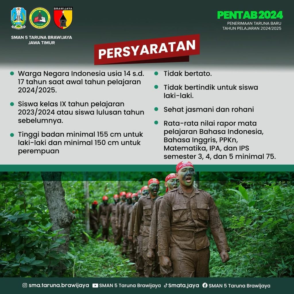 Pendaftaran secara online akan dimulai 18 Desember 2023 sampai 17 Januari 2024. Persiapkan diri kalian dalam PENTAB SMAN 5 Taruna Brawijaya Jawa Timur kali ini🥳