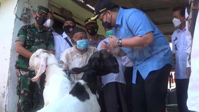 Bupati yang akrab disapa Mas Dhito ini menyerahkan sendiri kedua kambing tersebut kepada Mbah Katimin. Dua ekor kambing yang diserahkan, salah satunya tengah hamil.