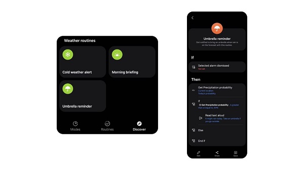 Tampilan Weather juga kini lebih realistis dan informatif, dengan animasi yang hidup dan tata informasi yang lebih rapi. Sementara itu, fitur Modes & Routines kini dapat memberikan rekomendasi berbasis kondisi cuaca. Misalnya, pengguna dapat mengatur routine, ketika ramalan cuaca menunjukkan peluang hujan di atas 50%, pengguna akan menerima notifikasi pengingat untuk membawa payung sebelum beraktivitas.