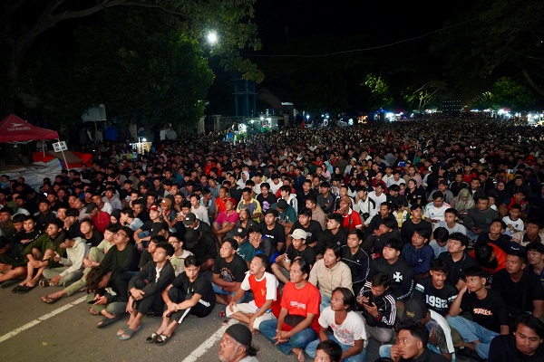 Kediri – Nonton bareng (nobar) laga kualifikasi piala dunia zona Asia 2026 putaran ketiga groub C antara Timnas Indonesia melawan China digelar di depan Kantor Dinas Perhubungan Kabupaten Kediri, Kamis (5/6/2025) malam.